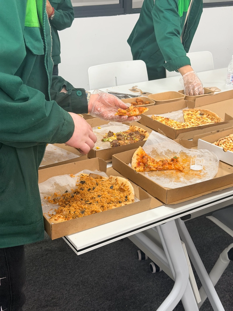 Haragi lehorrarekin eta algekin egindako pizza sorpresa atsegina izan zen. Gazi eta kurruskaria, algaren eta gazta luzarraren zapore freskoarekin konbinatuta. Iritsi bezain pronto mahaitik desagertu zen zapore paregabea. Guztiek probatu nahi zuten lehenik. Telefonoak atera ziren argazkiak ateratzeko, eta barreek aretoa bete zuten.